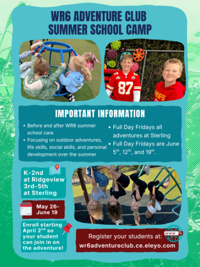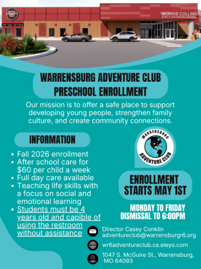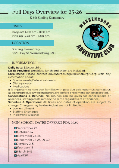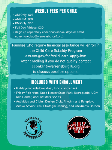 Welcome to Warrensburg Adventure Club! We are a K-6th Grade School Age Enrichment Program. Offered Monday-Friday before, after and out of school days. We work with the community and families to provide out-of-school care in a safe and engaging environment. Make a Payment! Click here! 2025-26 School yearEnrollment is Opened!Scroll down to "Need help" for enrollment instructions. Unique Youth Enrichment High Quality Youth Mentors Opportunities to Explore Contact InformationEmail: adventureclub@warrensburgr6.org(Email is quickest way to get us)Before and After School hours 6:00-7:45 am & 4:15-6:00 pmadventureclub@warrensburgr6.orgOffice Hours 10:00 am -2:00 pm. Program Questions: Enrollment, Billing, and other administrative questionscconklin@warrensburgr6.org660-747-8313Administration and Site Coordinator contact information, please click here. Hours of OperationMonday-Friday6:00 AM - 8:00 AM (Drop off before 7:45 am)3:30 PM - 6:00 PM (Pick-up after 4:15 pm)(1:30PM - 6:00PM on District Collaboration and Early Out Days due to staffing Pick-up is still after 4:15 pm everday)Camp Days K-6th @SterlingFull Day: 7:00AM - 6:00PMHalf Day: 12:00-6:00pm We do not offer Drop in Care. FOOD IN the Program K-6th Grade Program Fee 2024-25BEFORE AND AFTER SCHOOLAll weekly rates include Collaboration/Early-Out days. Which have been averaged out into a standard weekly fee. All contracts will have a standard weekly fee for Before and Aftercare, even on weeks with less days. Before and After Registration Fee: Non refundable for all families$15 per ChildStandard School Year RatesAM: $36 per weekPM: $51 per weekAM/PM: $72 per week Non School Days: Teacher PD and Work days register through your account. $30 Collab and Early OutEmail to ask for early out days only. Early outs are included with Before and Afterschool Care with no extra cost.$26Financial Assistance: Childcare Assistance Program through the State of Missouri This is based household income and is offered on a sliding fee. Here is the qualifying information for Child Care Subsidy Program . When you apply you will need current pay stubs, Childs SSN, tax information and DVN of the school you are enrolling in. Fees do not apply until we receive your acceptance letter. You are responsible for communicating with DESE Department of Childhood to get this financial support. To register you will need following information:Website : https://dss.mo.gov/fsd/child-care-apply.htm Child Care Subsidy Program phone 855-373-4636Warrensburg Adventure Club @ Ridge View(Serving K-2nd grade at Maple Grove and Ridge View) DVN: 002874117 Warrensburg Adventure Club@ Sterling (Serving 3rd-6th grade at Martin Warren and Sterling)DVN: 002327897Your Child Care Subsidy Program support is based on your income and has a sliding scale. The state will only be paying part of what a standard rate is for Adventure Club. The remainder will be charged and invoiced to you weekly through your online account. If you do not qualify for CCA, email CCA denial letter to adventureclub@warrensburgr6.org Non School/Early Out Dates of enrichment 2025-26 school year If enrollment is sustainable, full days of enrichment will be offered.**Early Outs: Email adventureclub@warrensburgr6.org to register $26 Each** - August 19-20 - September 26 - October 10, 23 - December 19 - February 12 - April 17 - May 21 **Non-School Days (Fall, Winter, Spring, and Professional/Teacher Work Days): $30 Each** - September 29 - October 24 - November 24-25 - December 22-23, 29-30 - January 2 - February 13 - March 9-13 - April 20 Adventure Club Program Handbook Adventure Club Programs K-2nd @ Ridge View Serving Maple Grove and Ridgeview 3rd-6th @ Sterling Serving Martin Warren and Sterling Click here to access Program information and Handbook. Need Help? If you need help enrolling your child in our program, please click the buttons below to view our help sheets: Enrolling in Adventure Club More Registration Help Submitting Schedule Changes Updating Emergency Contacts Managing Auto Pay Viewing Invoices Mobile Help Managing Authorized Pickups Our Vision:To offer a safe place to support developing young people, strengthen family culture, and create community connections. Our Mission:Partnering with families and the community to provide out-of-school care in a safe, nurturing environment. Offering non-traditional and developmentally appropriate academic enrichment that challenges children and families to grow physically, socially, emotionally, and intellectually. Links to other resources in our community: Community Food Services Warrensburg R6 School District Food ServicesManna Harvest WarrensburgFood Center Warrensburg Community Mental Health Resources Central Missouri Clinic for Individual, Couple, and Family Therapy Jobs in the Community Job Opportunities in Warrensburg R6 School DistrictOther opportunities in Warrensburg Healthy Living Resources Care Connection Free Zoom Online Workshops InfoCare Connection Free Over-the-phone Workshops InfoDescription of Workshops